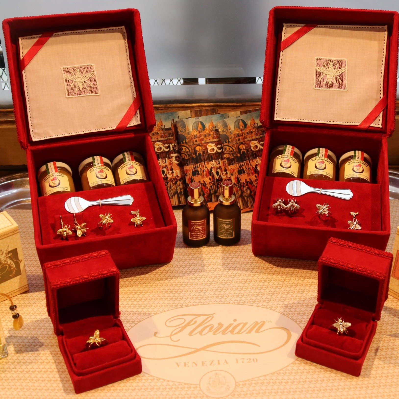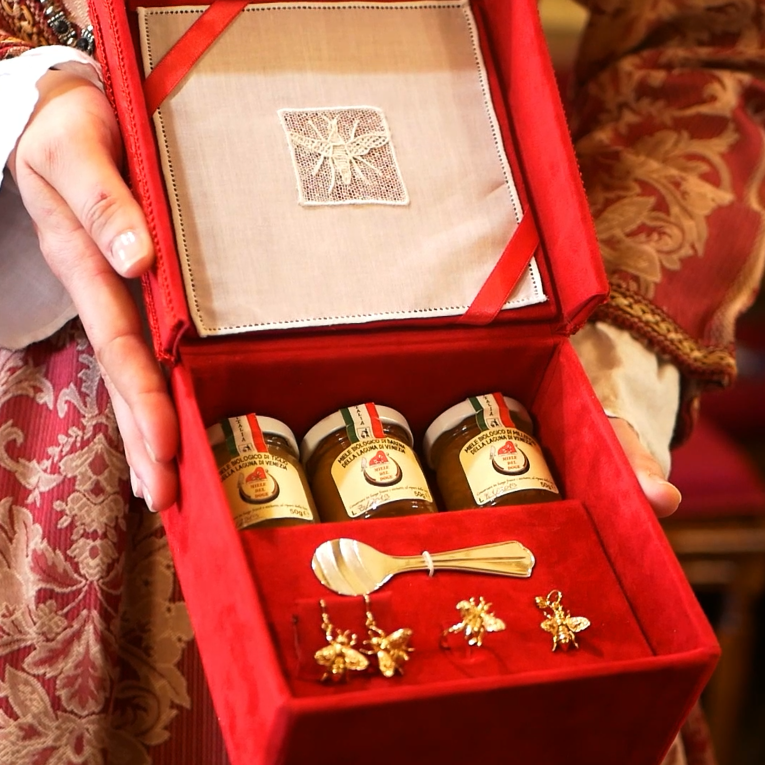 L’Autore e coordinatore del progetto Vittorio Baroni ha presentato i partecipanti e le realtà veneziane che cooperano al progetto. Valentina Lombardi e Marinello Flavio dell’Oreficeria Meneghetti, storytelling di Nadia De Lazzari e supporto dall’idea iniziale, fotografia di Riccardo Roiter Rigoni. L’orafo Stefano Ghezzo che ha creato le api d’oro, d’argento e il cucchiaino per il miele del Doge di Sant’Erasmo di Mara La Rosa e la sua famiglia. Scrigno del Doge in vellutino rosso di Andrea Baso, artigiano veneziano, erede della tradizione dei Vazineri con ape in merletto di Burano nella tovaglietta dell’Atelier Martina Vidal, Marta Perissinotto e Sergio Vidal. Film corto di Samuele Semenzato, Qual Buon Veneto Media House e la voce narrante di Sabrina Zanninello. Caffè Florian con lo Chef Pâtissier Cristiano Strozzi, il Direttore Renato Costantini e Cristiana Rivolta Sales & Marketing Department. Costumi di Coven Venice Project con Debora Gusson e Nadia Rigo in abiti del ‘500 creati da Elena Righetto. Dirette Web curate da Graziano Dal Fabbro Venezia360 – Arte, Storia, Cultura ed Eventi. Stampa book ExodProduction Studio. Il progetto nato nel 2019 da un’idea di Lido Oro Benon, ha visto partecipe il Comune di Venezia con l’Assessore al Turismo Simone Venturini e la Presidente del Consiglio Comunale Ermelinda Damiano. Si prevede l’estensione ad altre eccellenze veneziane ed è in corso di realizzazione un documentario.