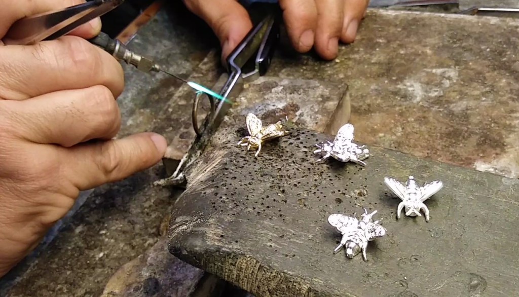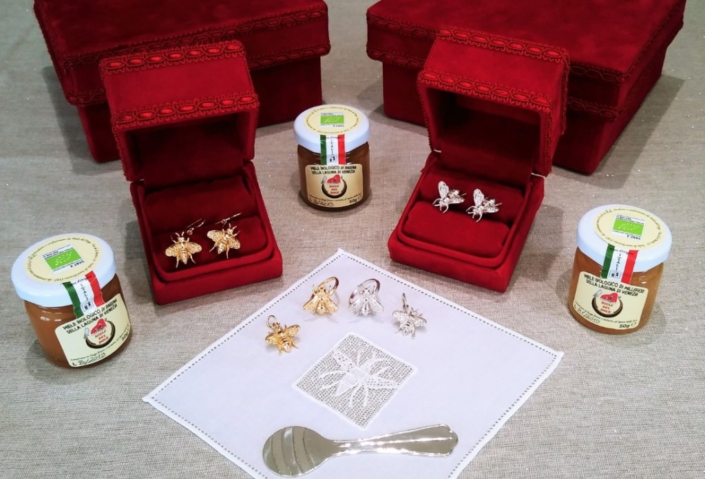 Api d’oro 750‰ KT 18 e d’argento 925‰ create con amore da Stefano Ghezzo come simbolo della sostenibilità e della resilienza, caratteristiche della venezianità espresse in anelli, pendenti, orecchini e il cucchiaino d’argento per gustare il nettare della Laguna di Venezia.