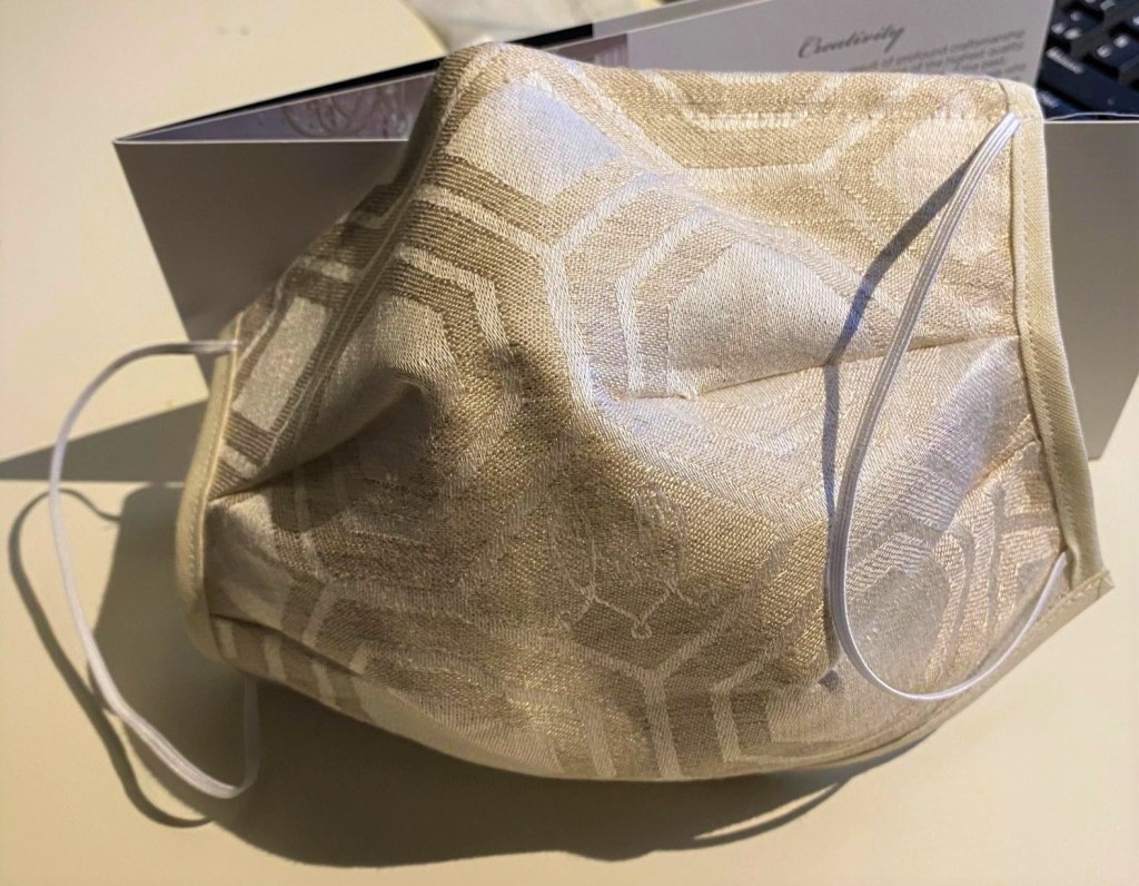 L’Atelier Martina Vidal, nel debutto dello Scrigno del Doge al Caffè Florian con presenti Marta e Sergio Vidal, ha presentato la mascherina che vedete nell’immagine. Molto apprezzata per respirabilità e comodità d’uso è composta da un filtro chirurgico, con ferretto appoggia naso, arricchita da prezioso tessuto buranello. L’idea di Marta esprime un motivo a rombi della linea Architettura Venezia pensata da Sergio che si è ispirato al pavimento dell’isola di San Giorgio.
